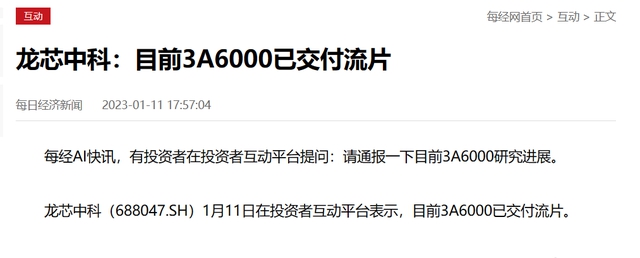 近日,在投資者互動(dòng)平臺(tái)上,有人咨詢關(guān)于3A6000芯片的研究進(jìn)展問(wèn)題,龍芯中科回復(fù)表示:目前3A6000已交付流片。這說(shuō)明,國(guó)內(nèi)下一代CPU首款芯片,基于自主化設(shè)計(jì),目前已經(jīng)完成了研發(fā)。